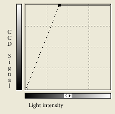 To allow imaging with shorter shutter times or in low light conditions when a longer shutter time is required but not possible the CCD-camera features an amplifier. The amount of amplification is called gain. The gain increases the slope of the light/output graph. Unfortunately the use of gain raises noise in the resulting image.